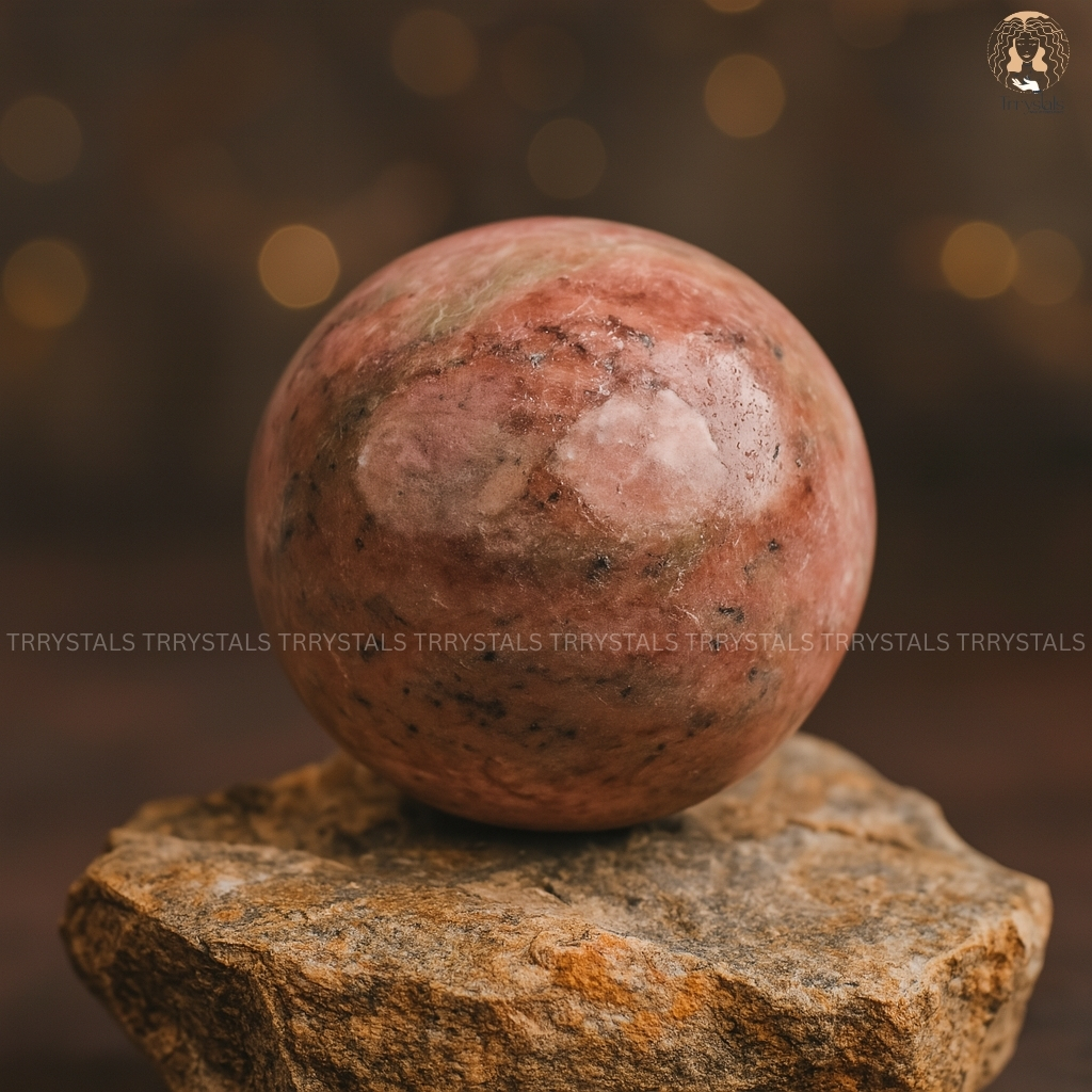 A striking pink-and-black sphere carved from natural Rhodonite, known as the Stone of Compassion and Emotional Balance. Rhodonite gently nurtures the heart, heals emotional wounds, and encourages forgiveness and self-love.